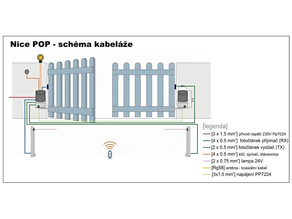 PP7024 je samostatný pohon Popkit pro křídlové brány, pro křídlo široké 150/200 cm a s hmotností 225/200 Kg. V pohonu Nice Pop PP7024 je vestavěná řídící jednotka POA1/A.