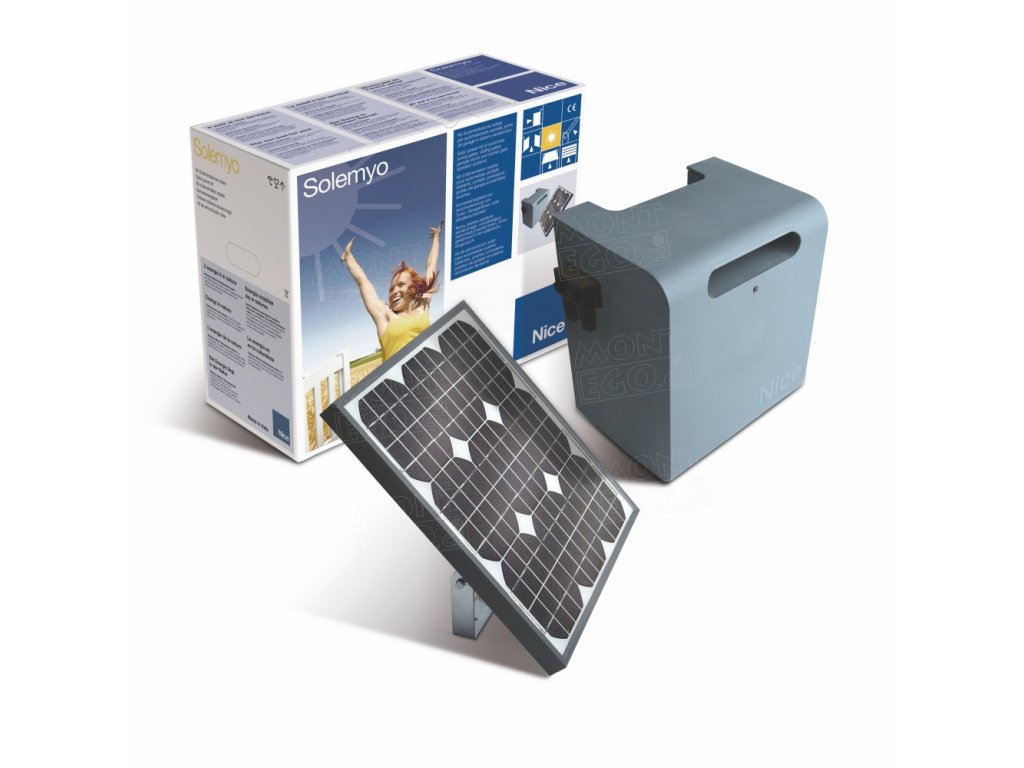 Sestava je určena pro pohony Nice Solemyo, které umožňují snadnou integraci solárního napájení bez nutnosti složitých úprav.